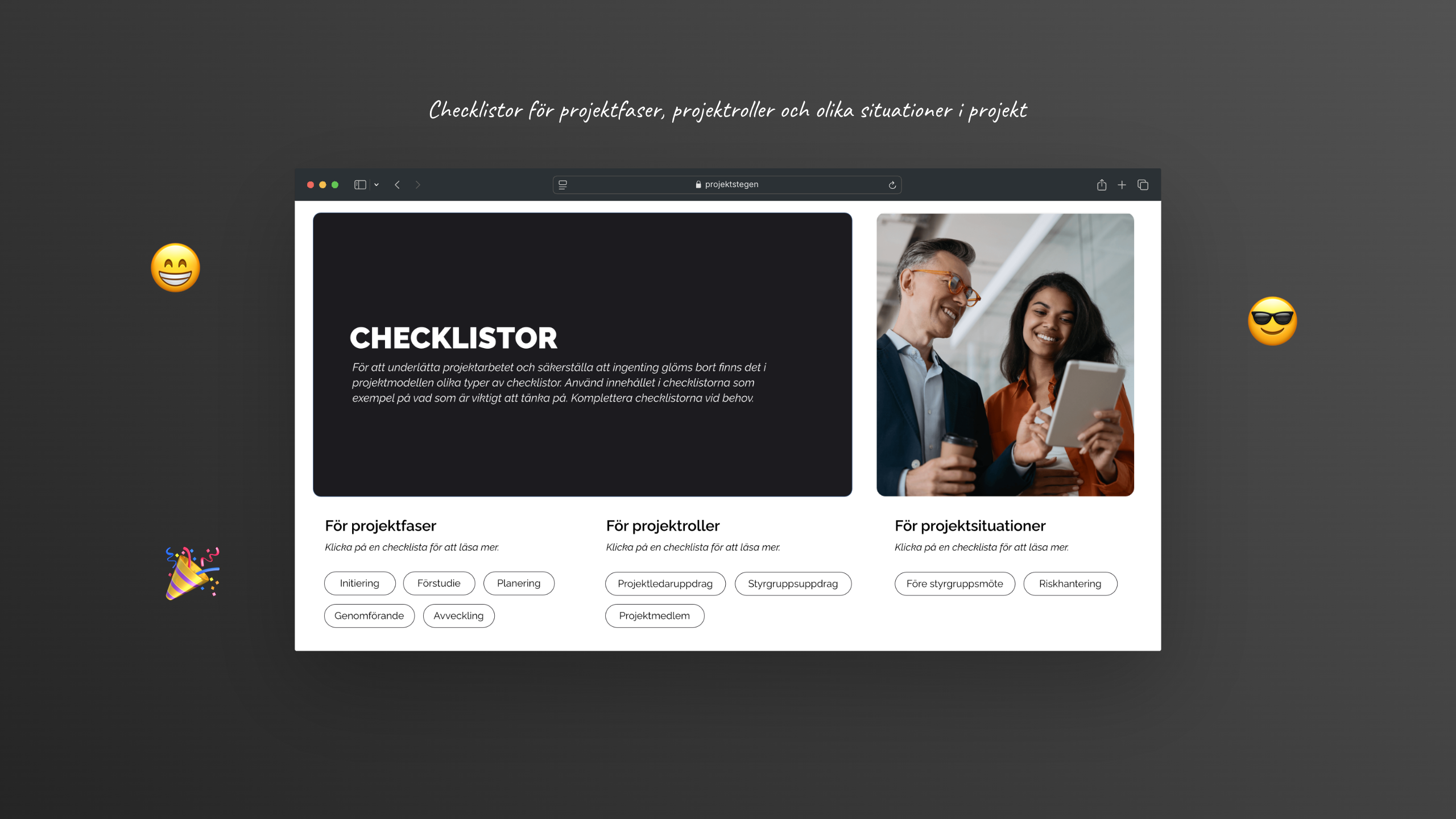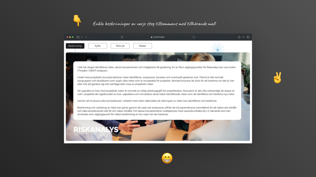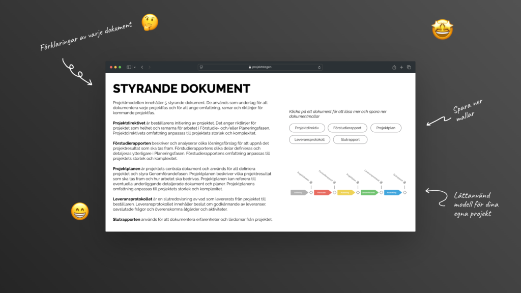 I kursporten finns också hela projektmodellen ProjektStegen® med beskrivningar, exempel och över 50 dokumentmallar. Läs mer om projektmodellen här.